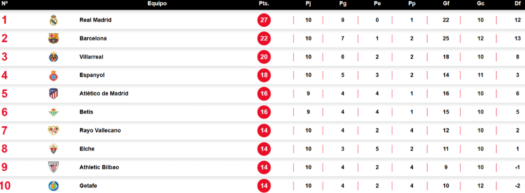 La Liga española ha dado un giro significativo a mitad de temporada con Real Madrid que se afirma como el líder indiscutible después de diez jornadas. El conjunto blanco ha abierto una brecha considerable en la tabla, acumulando 27 puntos gracias a nueve victorias y solo una derrota, lo que le otorga una ventaja clara en la lucha por el título.