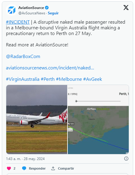 Un vuelo de Virgin Australia, identificado como VA696, tuvo que regresar al aeropuerto de Perth, debido a la conducta problemática de un pasajero que causó gran conmoción al correr desnudo por el pasillo del avión.