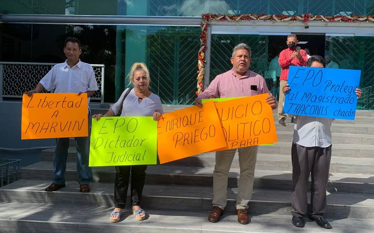 Con pancartas de ‘Libertad a Marvin’, ‘EPO dictador judicial’, ‘Juicio Político para Enrique Priego’ y ‘EPO protege al magistrado Traconis Chacón’, un grupo de personas protestó fuera del Congreso de Tabasco previó al informe anual de labores del Presidente del Tribunal Superior de Justicia (TSJ), Enrique Priego Oropeza.